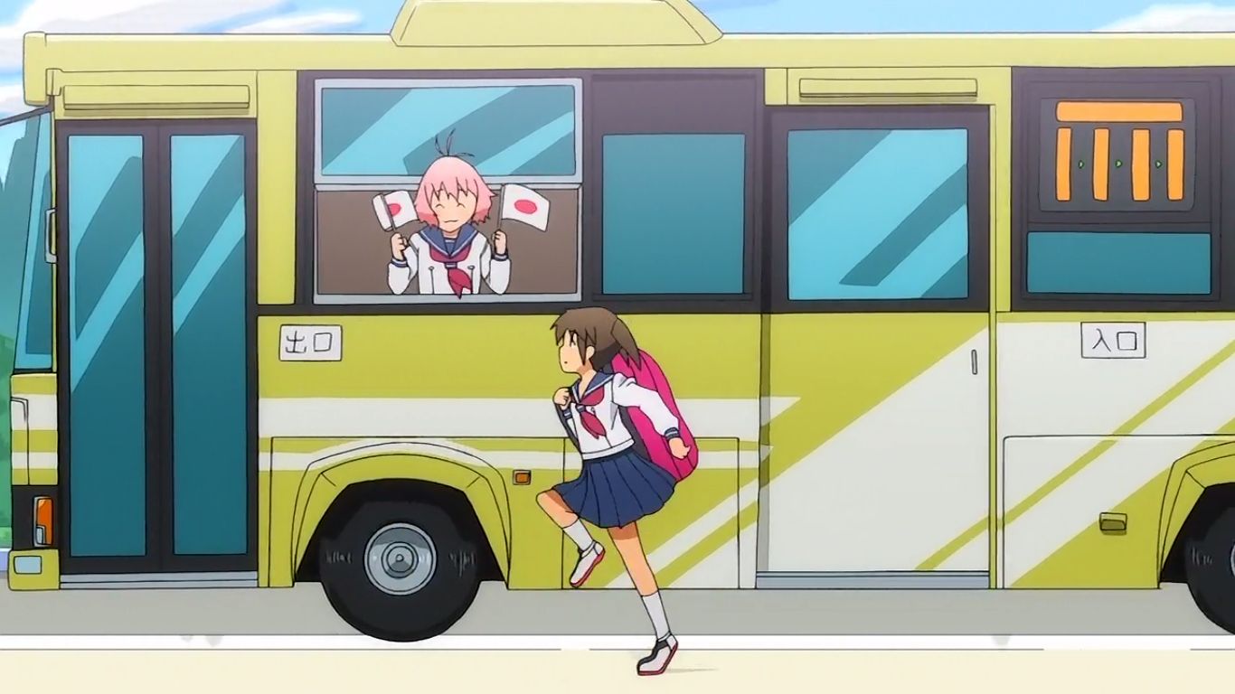 余裕そうに日の丸を振る彼女ですが、直後にバスが停留所に停まってしまい、バスから降ろされて大会まで走り込みだろうと怒られます。