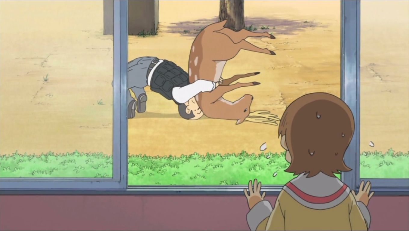 宿題を忘れて廊下に立たされ、ため息をつくゆっこ。ふと窓の外を見ると、そこに鹿がいるのを発見。さらにそれを捕獲しようとしている校長も。