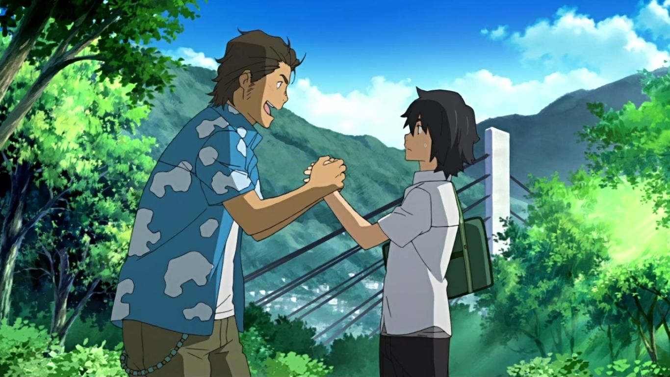 彼はじんたんに気がつくと、相棒と呼び、その手を握ります。「俺も見たぜ」「見たって何を?」「決まってんだろ?めんまだよ!」「えっ?」