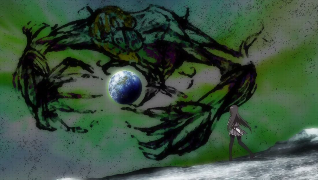 ただの概念にまで成り果てたまどか。その彼女に今まで地球に生きる物が蓄積してきた絶望が降り注ぎ、そして地球自体を覆っていこうとします。