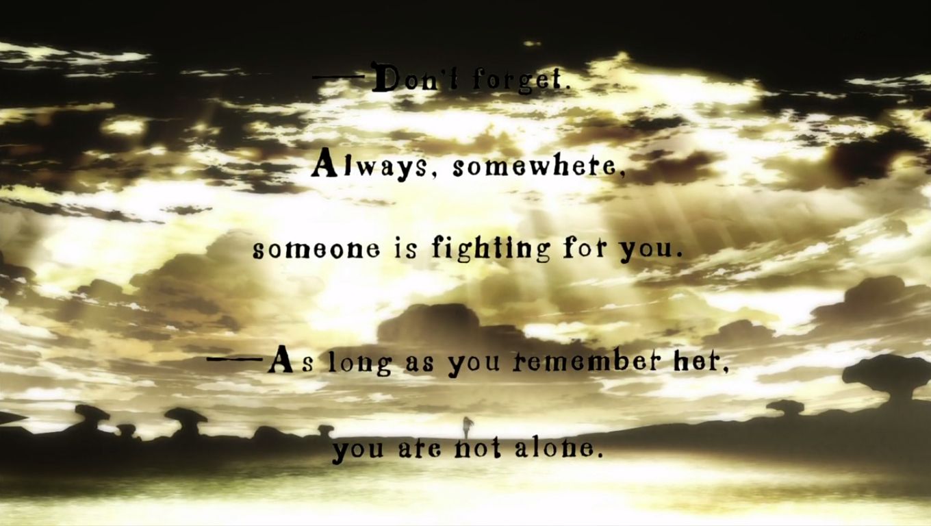 (忘れないで いつも、どこかで 誰かがあなたのために戦っている事を あなたが彼女を忘れない限り あなたは一人じゃない)