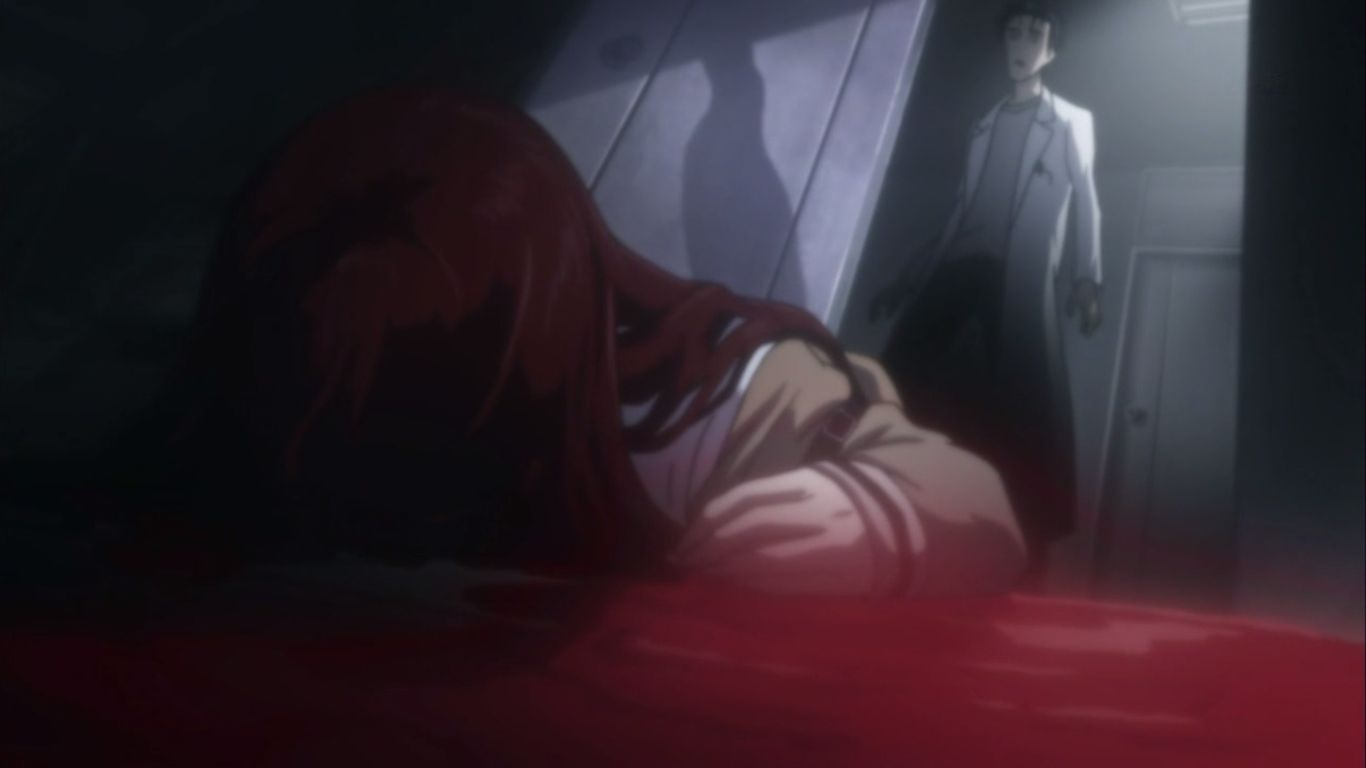 廊下を歩いていった先にある部屋の先で見たのは、倒れている人。それは紅莉栖でした、床には大量の血。すでに死んでいるのでしょうか。