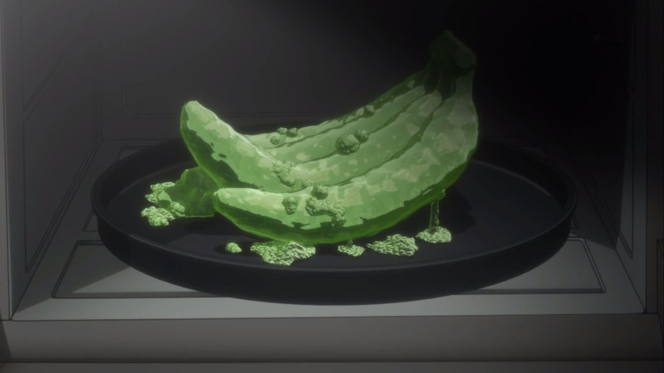 ターンテーブルが逆回転をはじめ、そしてバナナではない緑色のゲル状の何かが完成……!これを食べたことがあるというまゆしぃは凄すぎる!!
