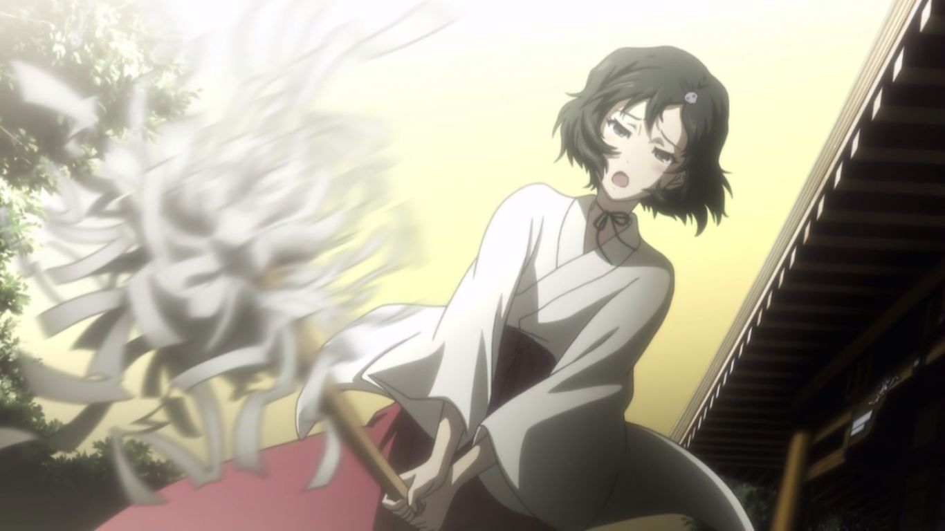その後、連絡を受けて岡部が向かった先は柳林神社。そこにいたのはまゆりと、素振りを続ける謎の巫女さんが…!彼女…いや彼の名前は漆原るか。
