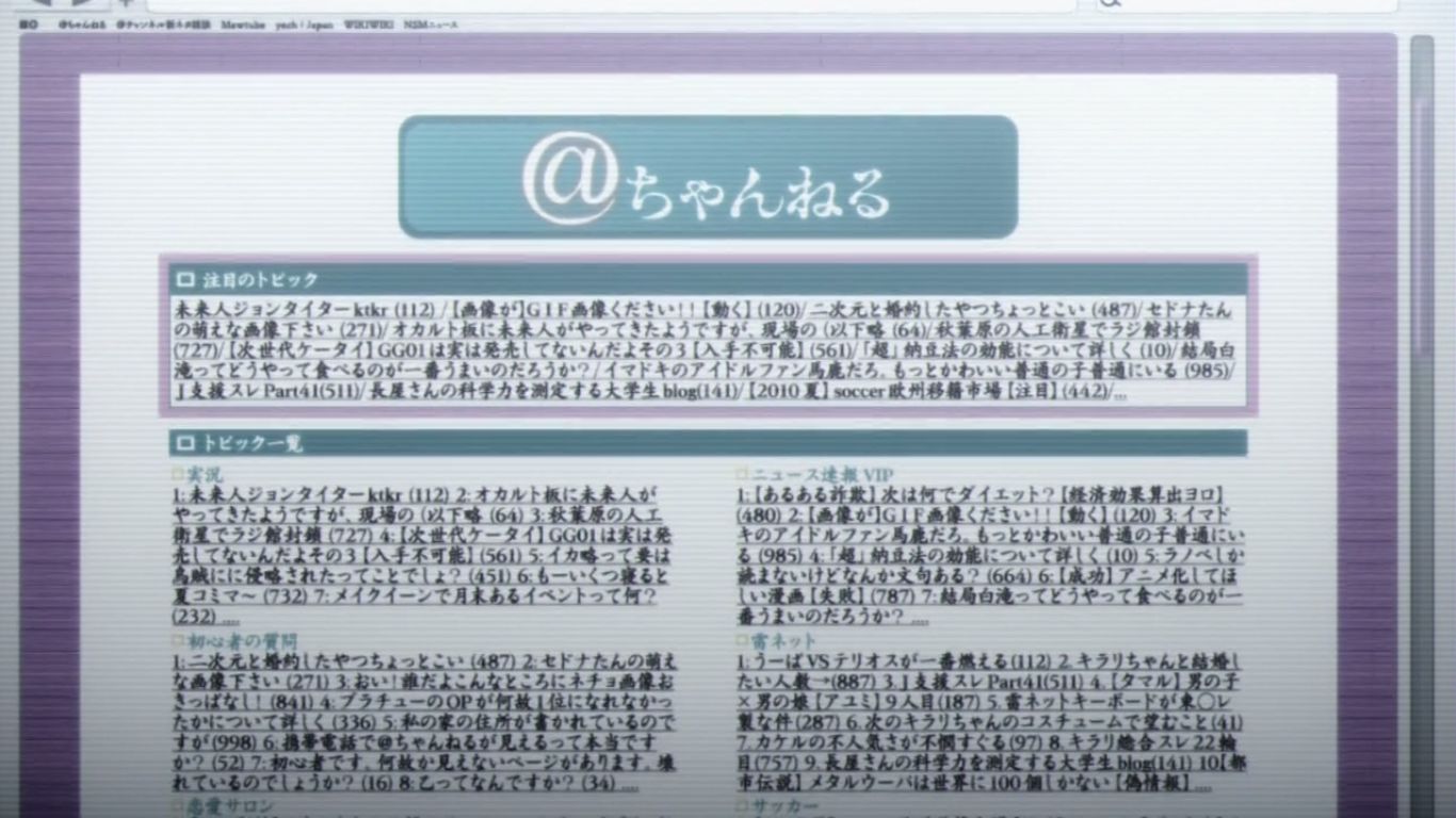 (俺が見たものは幻だったのか?…ん?ジョン・タイター?)途方に暮れる岡部は@ちゃんねるにジョン・タイターが現れたというスレを見つけます。