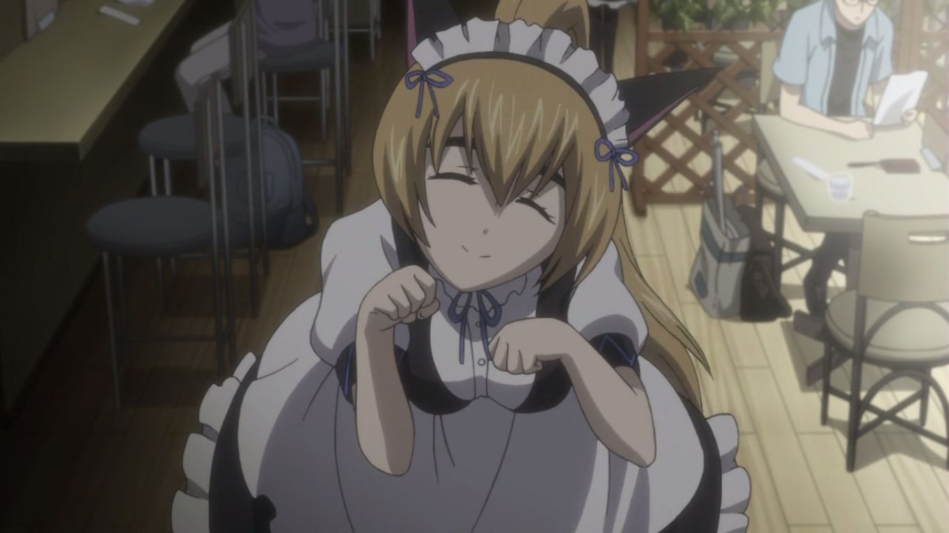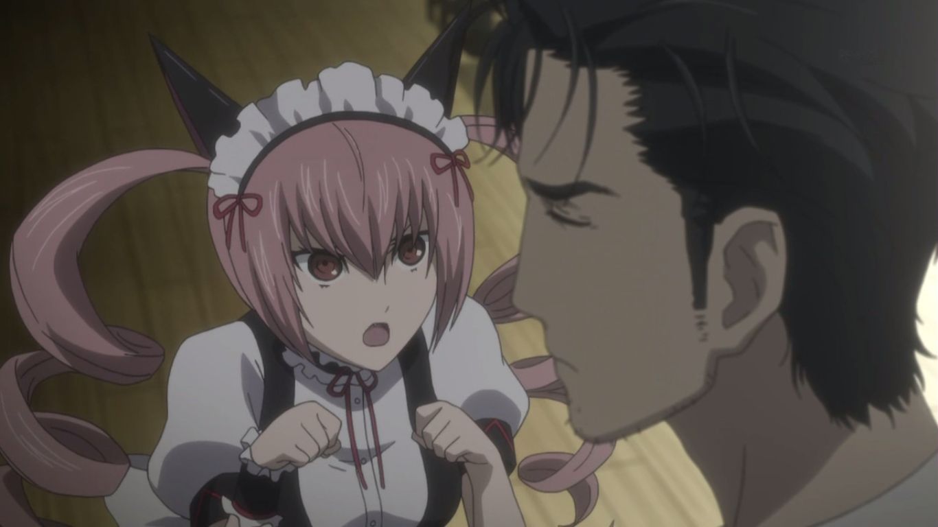 PCの事ならダル…ということでまゆりのバイト先であるメイクイーンニャン×2を訪れる岡部。まゆりことマユシィ・ニャンニャンが出迎えます。