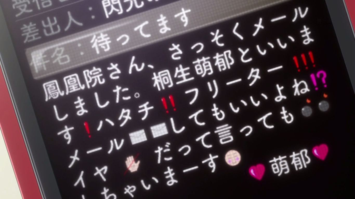 ”鳳凰院凶真”という自分の漢字を代わりに打ち込もうと携帯を借りようとする岡部を彼女は極端に拒絶。どうやら極度の携帯依存症のようです。
