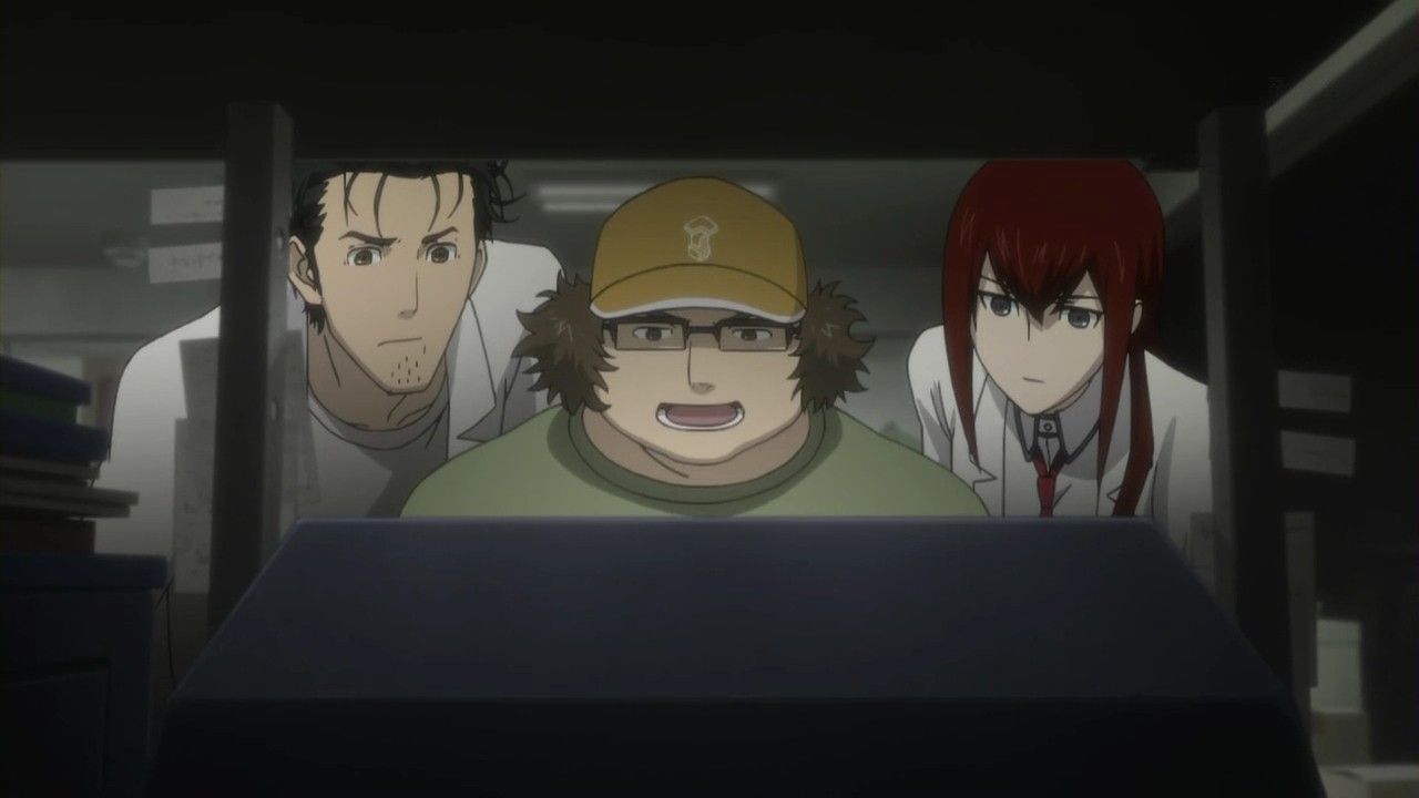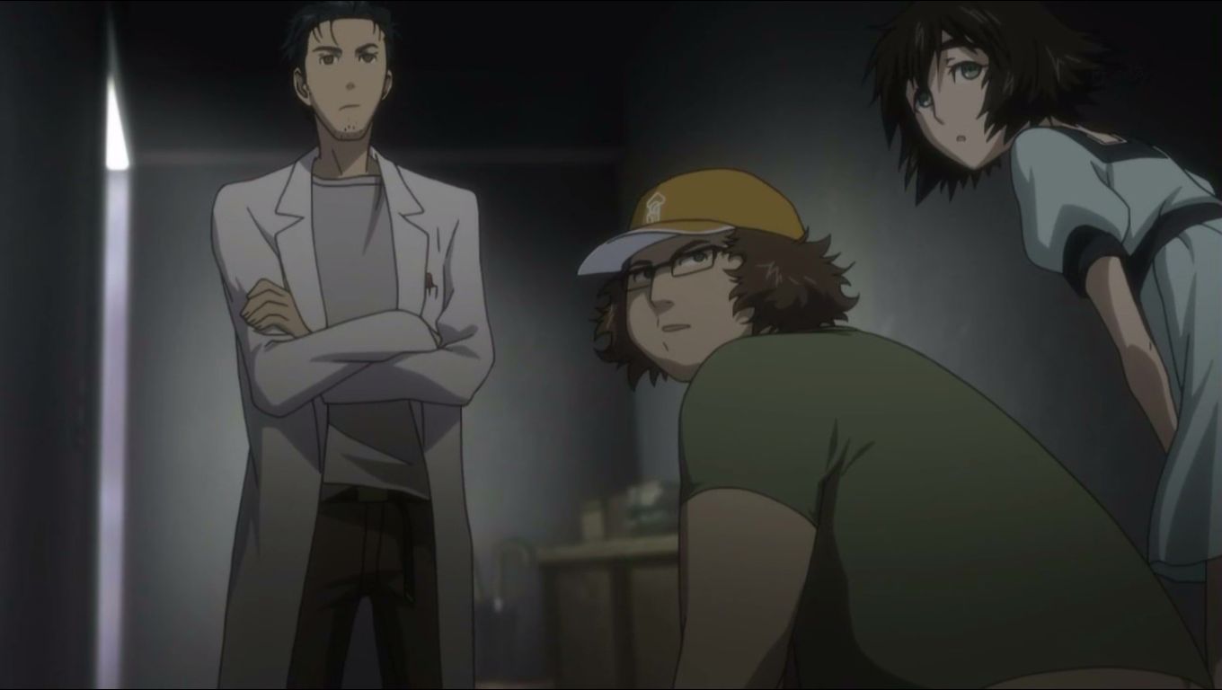 ミスターブラウンの声が聞こえ、鈴羽はブラウン管工房のシャッターを下ろそうとします。そこへ、IBM5100を持った岡部とクリスが帰ってきました。