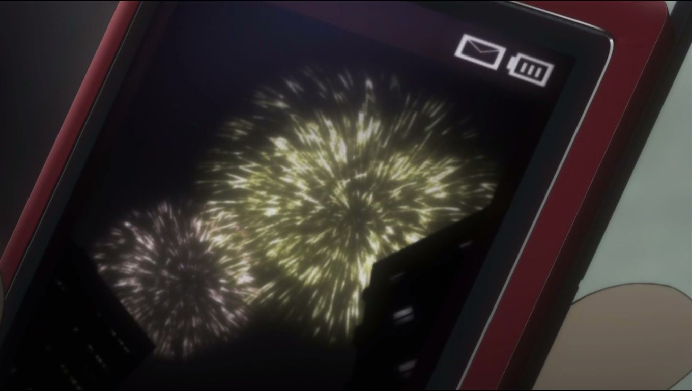 『初メールでーす : 想像以上!凄いね花火~~!』と花火の写真が添付されており、鈴羽も楽しそうな様子。それを見て岡部は微笑みます。