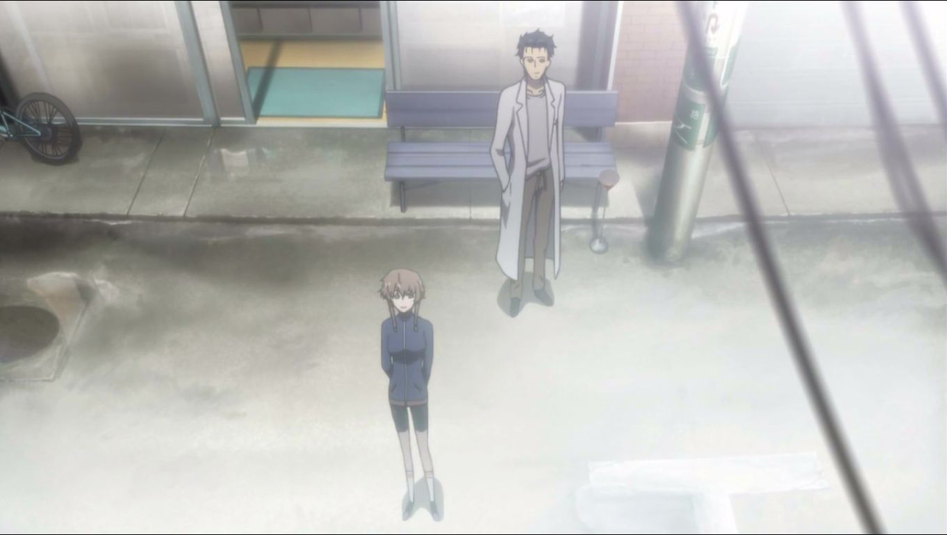 自分は鈴羽を逃がさない為に、彼女を尾行しようとする岡部でしたが、紅莉栖に「親子水入らずにさせてあげなさいよ」と言われあえなく断念…。
